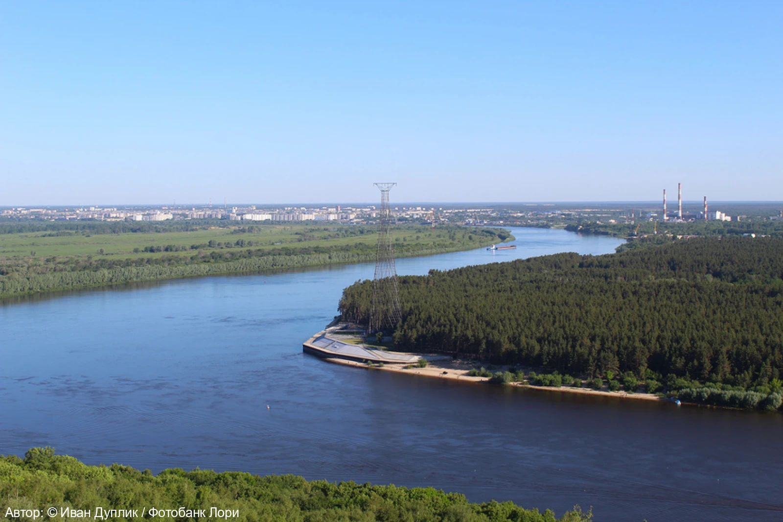 Это знаменитый гиперболоид инженера Шухова, построенный в 20-х годах ХХ века. Похожее на кружевную новогоднюю ель сооружение – это бывшая опора ЛЭП. Она стоит недалеко от воды на укреплённом бетоном берегу.